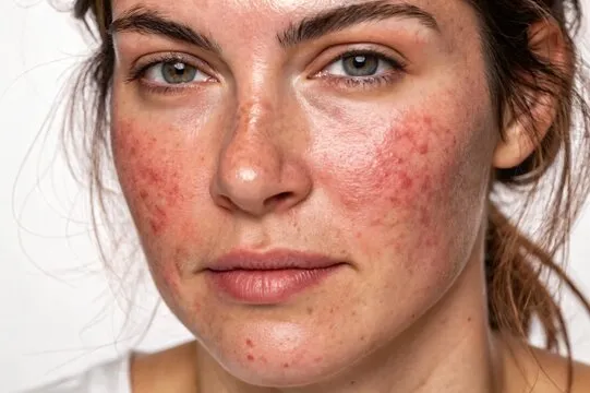 Rosacea is a chronic skin condition that causes facial redness, visible blood vessels, and flare-ups of pimples or bumps often mistaken for acne.