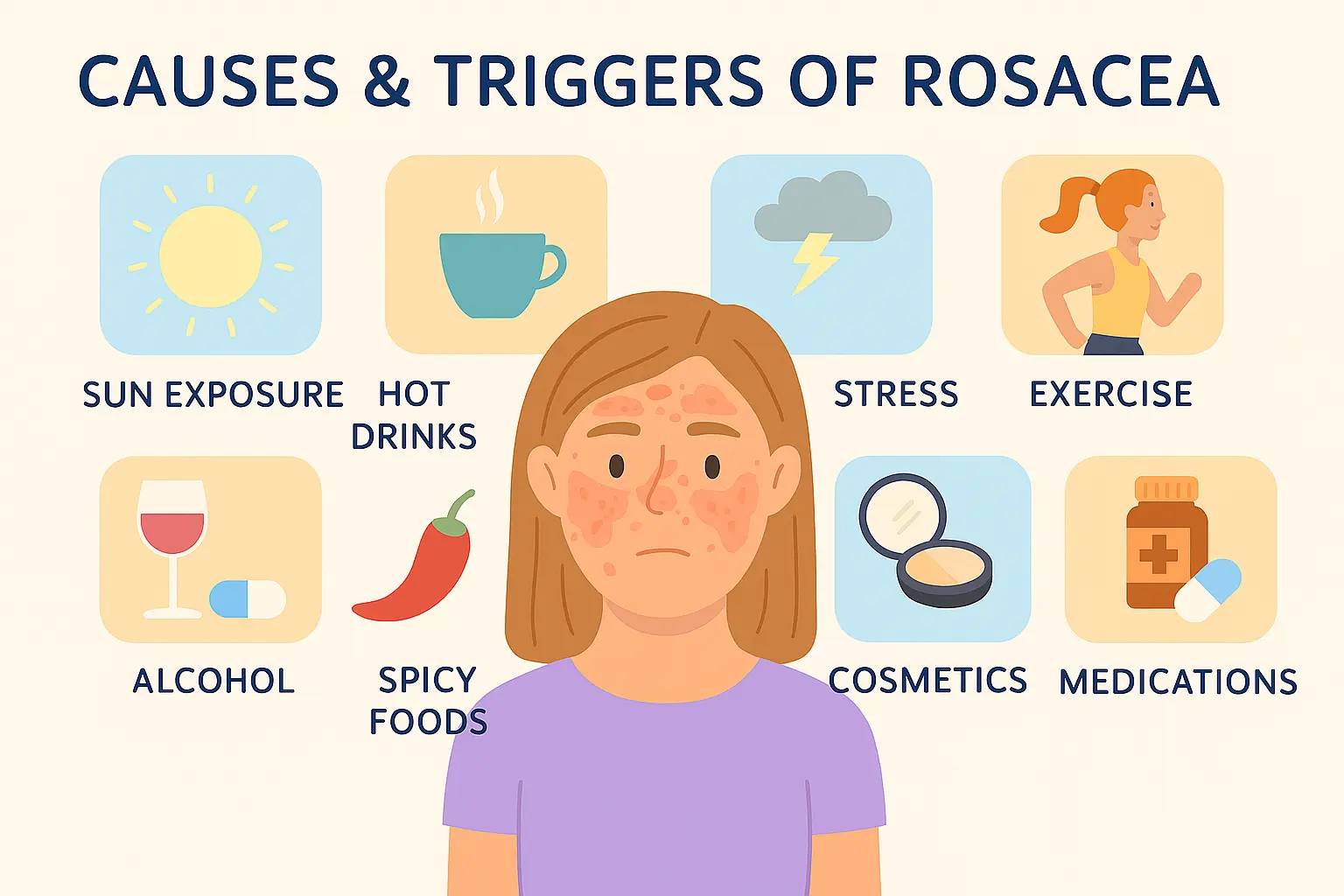 Flare-ups are often triggered by heat, spicy foods, alcohol, stress, sun exposure, or harsh skincare. Identifying and managing your personal triggers is key to long-term control.